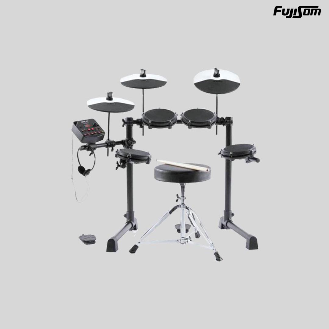 Tudo que você precisa para começar a tocar bateria agora! Tocar bateria nunca foi tão acessível! Apresentamos o Debut Kit da Alesis, um sistema completo de bateria eletrônica em uma só peça. O Debut Kit vem com absolutamente tudo que você precisa para começar a tocar bateria imediatamente! São 4 pads de 6″, produzidos em malha ajustáveis afim de reduzir ruidos e entregar uma ótima sensação ao serem tocados. O kit conta também com 3 pratos com superfície de 10″ para que você nunca perca o rítmo. O bumbo e o chimbal são controlados por pedais responsivos. O kit acompanha também um banco ajustável, fones de ouvido e baquetas. Baterias que soam como nenhuma outra! O módulo de som inclui 10 presets de bateria clássicas e modernas, customizadas pela Alesis. Esses kits contêm 120 sons de bateria individuais e utilizam a tecnologia Intelligent Dynamic Articulation™ para proporcionar um som e uma tocabilidade incrivelmente realistas. O módulo de som pode ser conectado a um sistema de som externo ou a um amplificador, como o Alesis Strike Amp 8 (vendido separadamente), usando saídas estéreo de ¼. Você também pode conectar seus fones de ouvido para praticar silenciosamente e em privacidade. O módulo de som do Debut Kit também apresenta o modulo Drum Coach integrado, incluindo 30 faixas para tocar junto, bem como exercícios rítmicos especialmente projetados para ajudar a desenvolver e melhorar suas habilidades. Além disso, há uma entrada auxiliar P2 que permite que você toque suas músicas favoritas do seu smartphone ou tablet. Especificações Técnicas